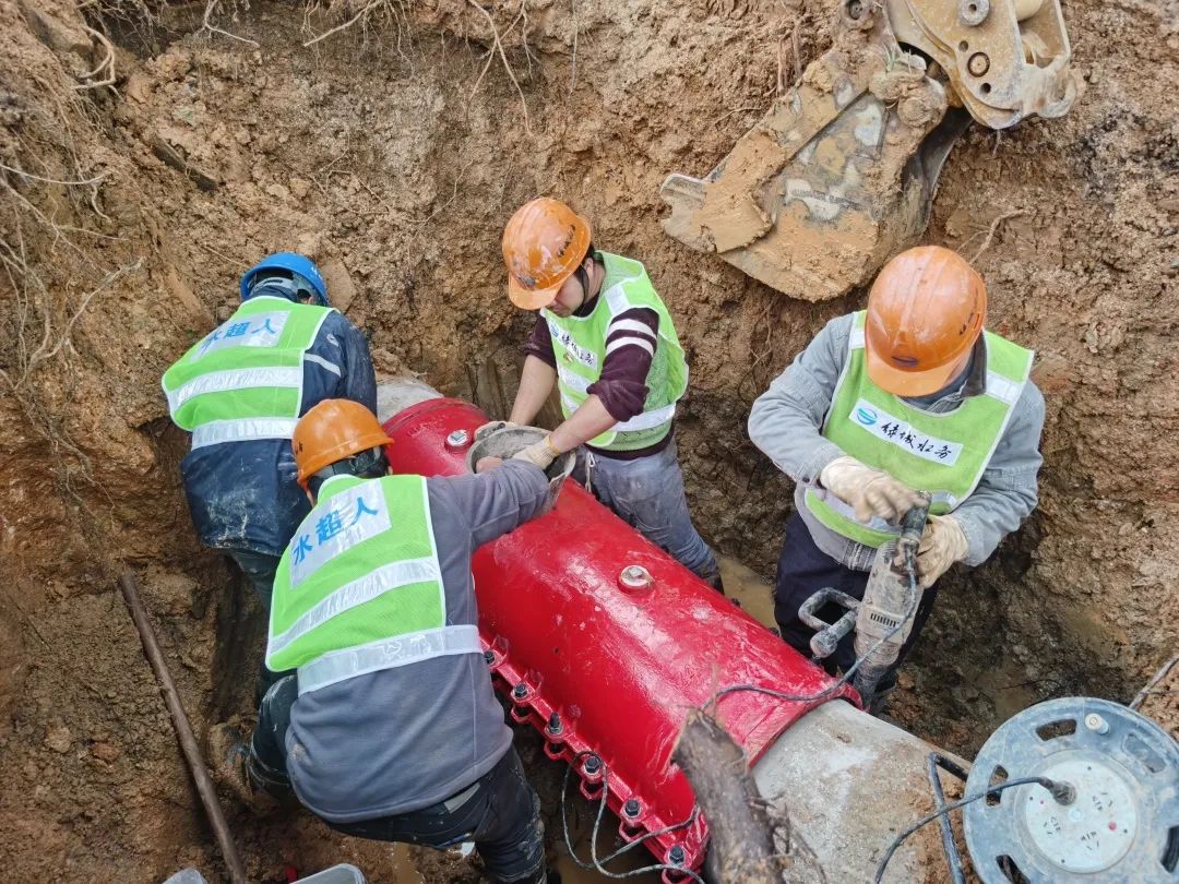 經(jīng)現(xiàn)場勘查,確定是地下一根DN400水泥管突發(fā)爆裂滲水,“水超人”應(yīng)急搶修隊員立即投入“戰(zhàn)斗”。“春節(jié)期間保供水刻不容緩,我們務(wù)必爭分奪秒,盡快恢復(fù)通水,將停水對市民的影響降到最低”,搶修班班長徐振峰一邊指揮搶修隊伍進(jìn)行搶修,一邊緊急安排送水車確保市民應(yīng)急用水。搶修隊員依據(jù)以往豐富的經(jīng)驗,在錯綜復(fù)雜的地下管線中快速找到漏水點后立即開展管道修復(fù)工作。當(dāng)天陰雨綿綿,現(xiàn)場氣溫降到10℃以下,在水中堅持作業(yè)的搶修隊員們?nèi)頋裢福瑸榱藫寱r間趕進(jìn)度,隊員們冒著瑟瑟寒風(fēng),在冰冷的環(huán)境下輪流上陣,從趕赴現(xiàn)場處置到恢復(fù)供水只用了5小時,高質(zhì)高效完成了沙井大道DN400水泥管的搶修任務(wù)。今年春節(jié)期間南寧遭遇的低溫寒潮天氣給管網(wǎng)管理處帶來了不小挑戰(zhàn),據(jù)統(tǒng)計,春節(jié)期間公司共出動搶修人員1934人次、搶修車輛312車次,送水車31車次,全力為城市供水命脈暢通保駕護(hù)航。