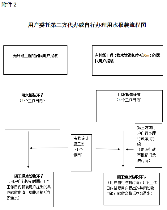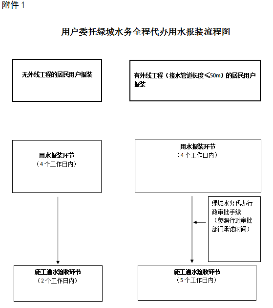 ①委托綠城水務全程代辦的,無外線工程施工通水驗收時間不超過2個工作日,有外線工程(外線工程長度≤50m)施工通水驗收時間不超過5個工作日,不包含辦理行政審批手續時間。