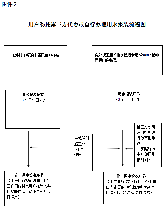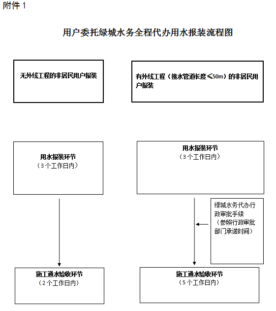 ①委托綠城水務(wù)全程代辦的,無(wú)外線工程施工通水驗(yàn)收時(shí)間不超過(guò)2個(gè)工作日,有外線工程(外線工程長(zhǎng)度≤50m)施工通水驗(yàn)收時(shí)間不超過(guò)5個(gè)工作日,不包含辦理行政審批手續(xù)時(shí)間。