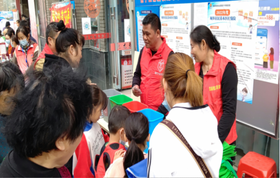 圖為河南水廠黨支部黨員志愿者正在耐心指導(dǎo)社區(qū)居民識(shí)別垃圾分類