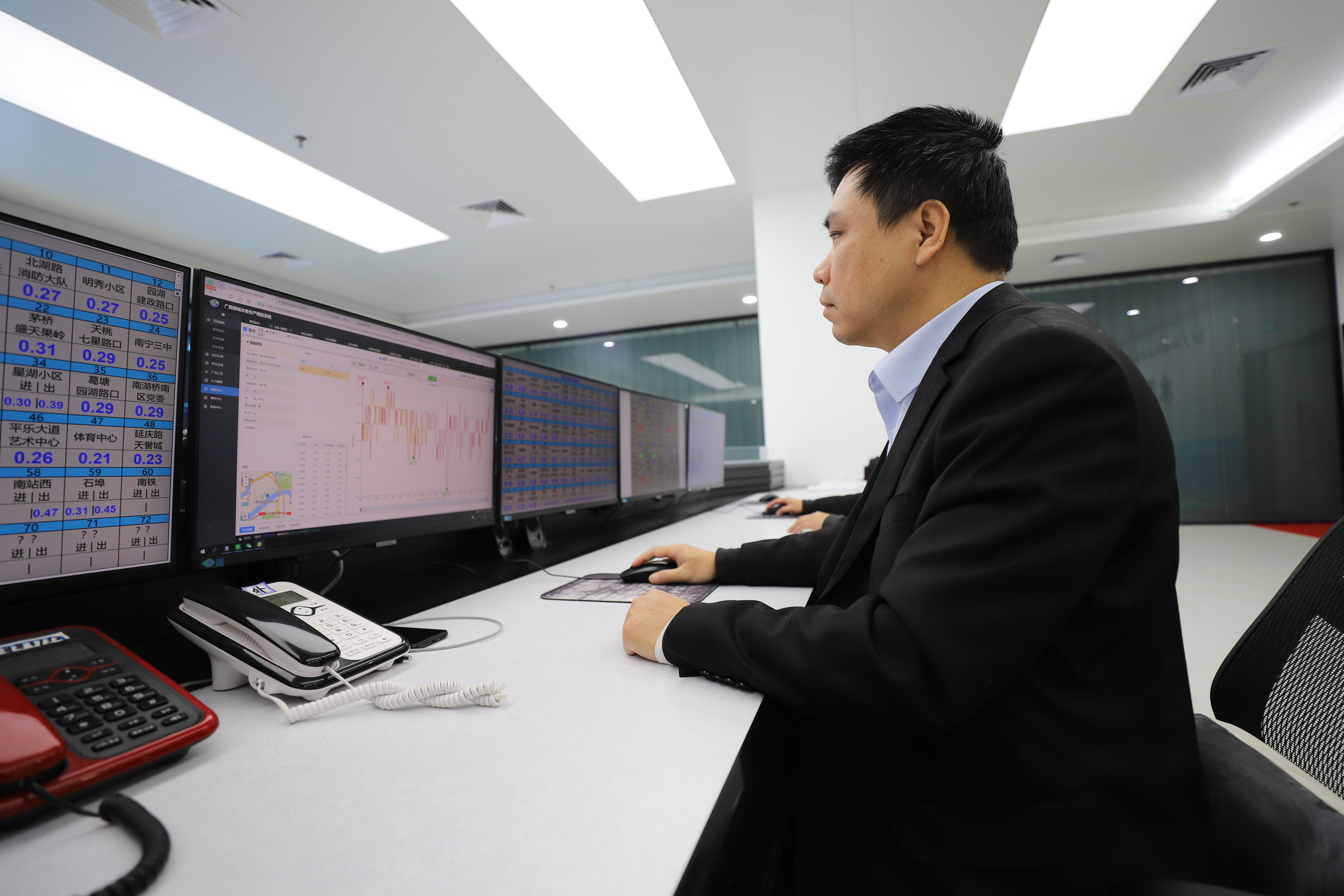 2月1日大年初一,廣西綠城水務(wù)股份有限公司(簡稱“綠城水務(wù)”)調(diào)度檢測中心大樓內(nèi),已經(jīng)連續(xù)第二天來值班的調(diào)度員謝毅早早就坐在水務(wù)調(diào)度中心的監(jiān)控臺前,仔細(xì)查看全市各測壓點(diǎn)的每個(gè)數(shù)據(jù)。謝毅介紹,春節(jié)期間很多人回鄉(xiāng)過年,用水量比平日減少,水壓變化大,他們需要根據(jù)生產(chǎn)調(diào)度系統(tǒng)上的水壓變化進(jìn)行預(yù)判,及時(shí)相應(yīng)做調(diào)節(jié)措施,確保城市水壓能夠達(dá)到合理均衡的狀態(tài)。