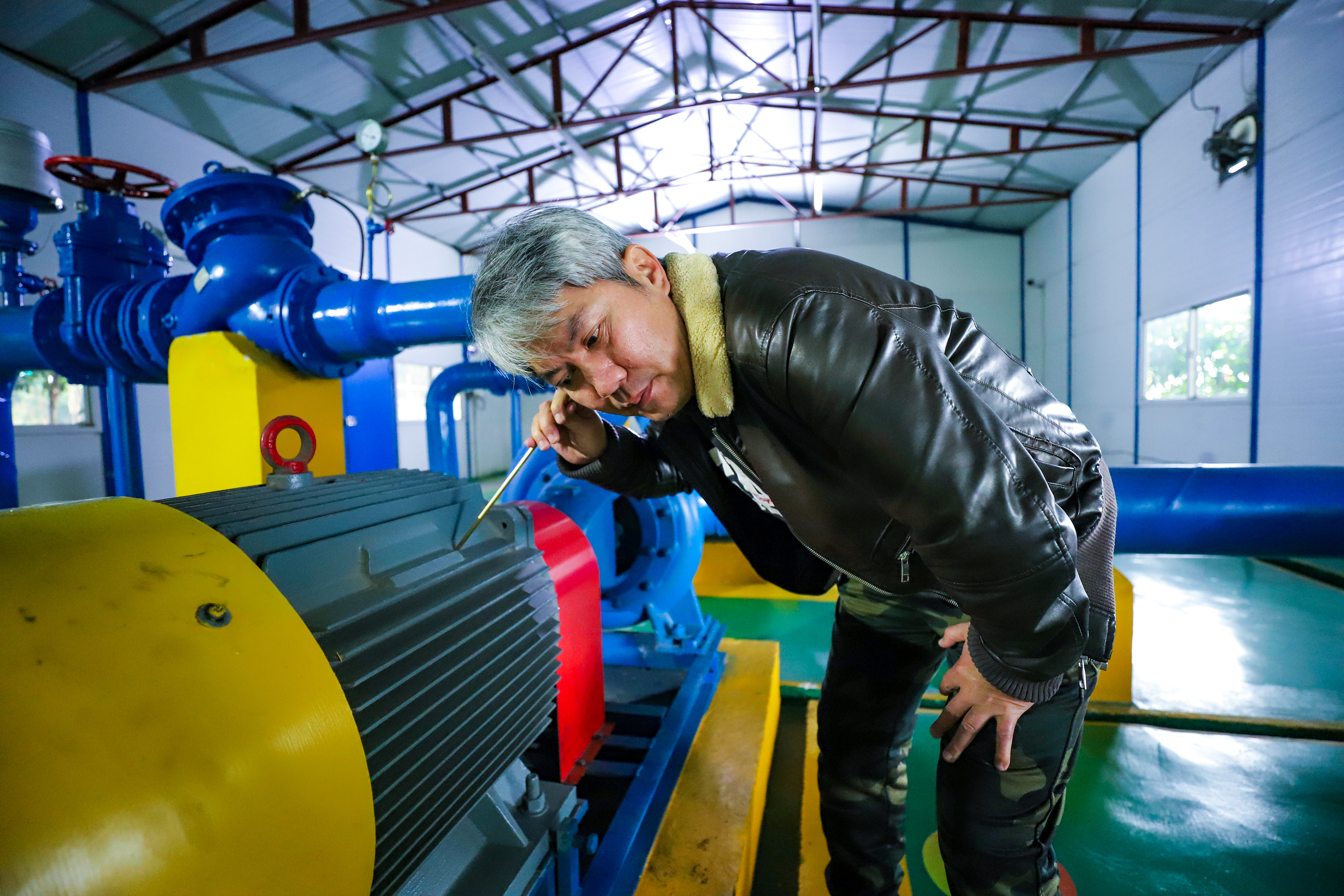 在位于柳沙半島的柳沙加壓站里,凌鐵水廠巡檢員覃陽打開手機(jī)的APP告訴記者,公司建立的生產(chǎn)調(diào)度系統(tǒng)可以通過手機(jī)隨時(shí)查看公司整個(gè)水壓點(diǎn)的情況。今天早上,他看到APP上的數(shù)據(jù)有一點(diǎn)異常,就馬不停蹄趕到現(xiàn)場排查情況。在泵房里,覃陽仔細(xì)查看了泵站出口水壓和入口水壓,又從墻上拿起一根金屬材質(zhì)的棍子,像醫(yī)生拿著聽診器聽診一樣將棍子放在加壓泵上,覃陽介紹,聽棍的作用是排查機(jī)器運(yùn)轉(zhuǎn)過程中是否存在異響,從而判斷故障位置,及時(shí)維護(hù)保養(yǎng)。經(jīng)過一番調(diào)節(jié)操作,泵房出水口的水壓慢慢地變成正常值,覃陽舒了一口氣,說道:“這個(gè)加壓站的正常運(yùn)行關(guān)系著千家萬戶的用水穩(wěn)定,安全供水一刻也不能松懈”。