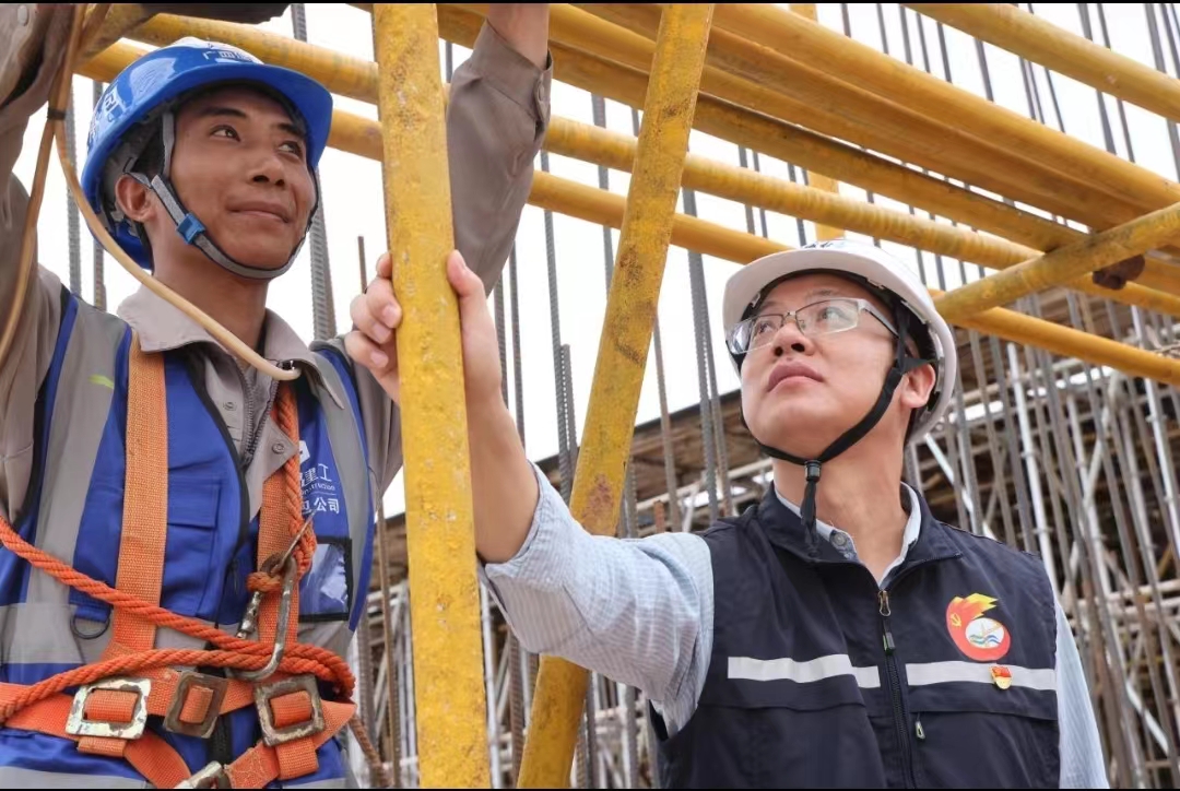 (“水工兵”建設(shè)先鋒隊隊員覃長瑜(右)正一絲不茍地和施工方查看鋼筋綁扎情況)