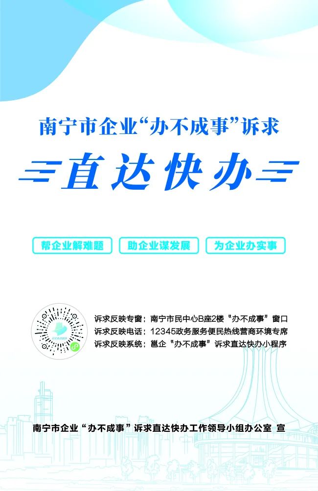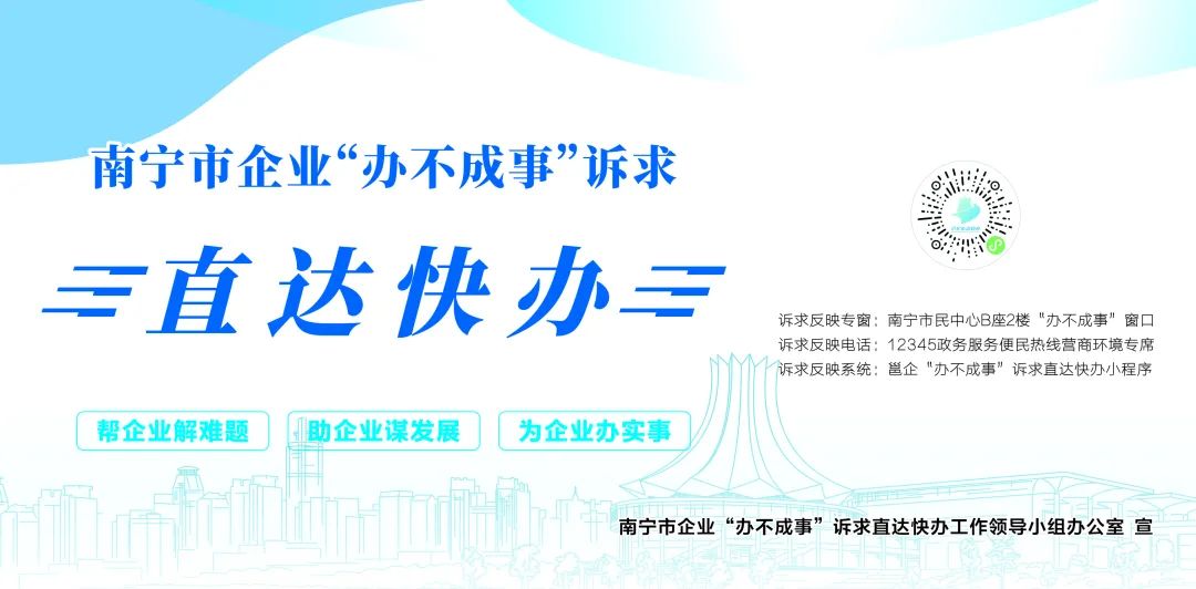 為貫徹落實中央、自治區(qū)經(jīng)濟工作會議精神,優(yōu)化首府營商環(huán)境,南寧市建立企業(yè)“辦不成事”訴求直達(dá)快辦工作機制,依托南寧市民中心“辦不成事”訴求窗口、12345優(yōu)化營商環(huán)境專線、“邕企辦不成事訴求快辦”小程序收集企業(yè)訴求,暢通訴求反映渠道,整合紀(jì)檢監(jiān)察監(jiān)督、行政監(jiān)督、司法監(jiān)督力量推動責(zé)任落實,構(gòu)建訴求受理、快速響應(yīng)、高效辦理、答復(fù)反饋、跟蹤督辦、改進提升的全過程閉環(huán)管理體系,幫助企業(yè)破除“辦不成事”的難點、堵點、痛點、瘀點,及時解決企業(yè)經(jīng)營發(fā)展難題、積極回應(yīng)關(guān)心關(guān)切、幫助企業(yè)提振信心,切實為企業(yè)解難題、辦實事,為建設(shè)面向東盟開放合作的國際化大都市開好局起好步提供有力支撐。