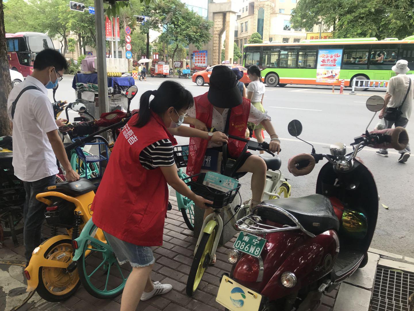共享單車為居民提供了便利,唱響了綠色出行的理念,然而亂停亂放、隨意毀壞等現象接踵而來,成了靚麗風景線上一抹不文明的色彩。青秀區津頭路口周邊都是老舊小區,道路狹窄,交通擁擠,共享單車隨便擺放的問題比較嚴重。凌鐵水廠的志愿者們充分發揚了不怕臟、不怕累、不怕苦的工作作風,在青秀區街頭開展“”共享單車隨手扶志愿活動”,對主干道出現共享單車扎堆、占道、歪倒的情況,他們會將車扶好,排放整齊,而對于一些零散停放的車,他們便集中搬到一個地方排好。